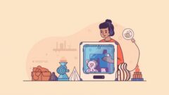 優しい色合いの平面的なイラストの人が3Dプリンター用のフィラメントを選んでいる様子 3Dプリンター